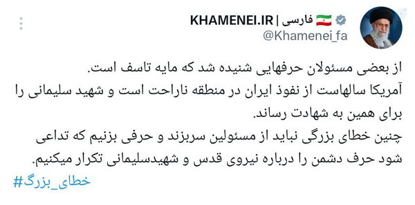 🚨🚨🚨#بسیار_مهم ؛؛؛🇮🇷از بعضی مسئولان حرفهایی شنیده شد که مایه تاسف است.#آمریکا سالهاست از نفوذ ایران در منطقه ناراحت است و شهید سلیمانی را برای همین به شهادت رساند.چنین خطای بزرگی نباید از مسئولین سربزند و حرفی بزنیم که تداعی شود حرف دشمن را درباره نیروی قدس و شهید سلیمانی تکرار میکنیم.
