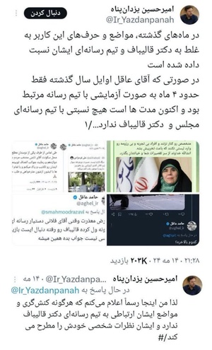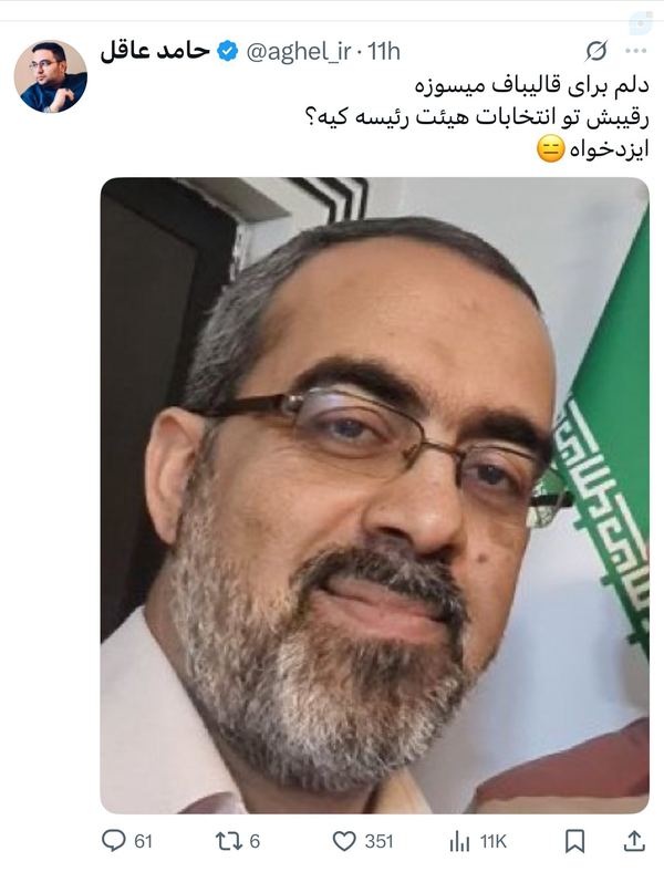 @Amir_Ezzati27 May 2025#قالیباف_مجددا_رئیس_شد کسی خوشحال نشد و تبریک های عمومی ندیدیم و نه شنیدیم ، همینکه جایی در قلب مردم ندارند#بزرگترین_شکست_وفاقیون_رقم_خورد.