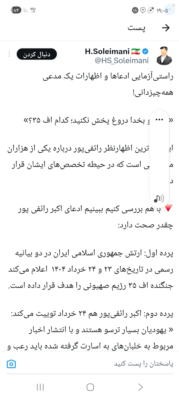 سادسا: در این ایام کم اخبار دروغ غرورآفرین پخش نشد! مانند به هلاکت رسیدن دیوید بارنیا رئیس موساد؛ سقوط یکی از B2ها در ایران یا انتشار تصویر خلبان زن یا تایید اسارت خلبان اسرائیلی توسط ترامپ و… و توصیه موکد من این است مادامی که اطمینان حاصل نشده نباید نسبت به انتشار خبری اقدام نمود.
