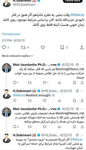 به نظرم شما بهتر است پیگیر همان پخش اعترافات خلبان باشید و البته راجع به مشاوره دادنتان به معیر جاودانفر یهودی صهیونیست ساکن اسرائیل درباره زمان مناسب برای حمله نتانیاهو به سوریه و لبنان توضیح بدهید!