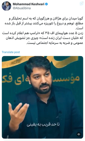 ثالثا: تاکنون در دادگاه محترم هیچ نشر اکاذیبی هم اثبات نشده چه رسد به اینکه به قصد تشویش اذهان عمومی باشد!رابعا: هنوز هم بر سر حرف خود هستم، اگر جنگندهای ساقط یا خلبانی اسیر شده؛ رسانهایکردن آن با ملاحظات حفاظتی لازم؛