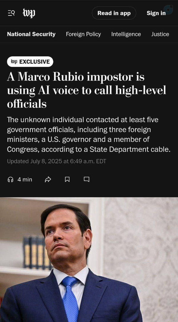 @SEH3139 July 2025Replying to andواشنگتنپست: فردی با استفاده از هوش مصنوعی توانست با تقلید صدای مارکو روبیو با برخی مقامات آمریکایی تماس بگیرد