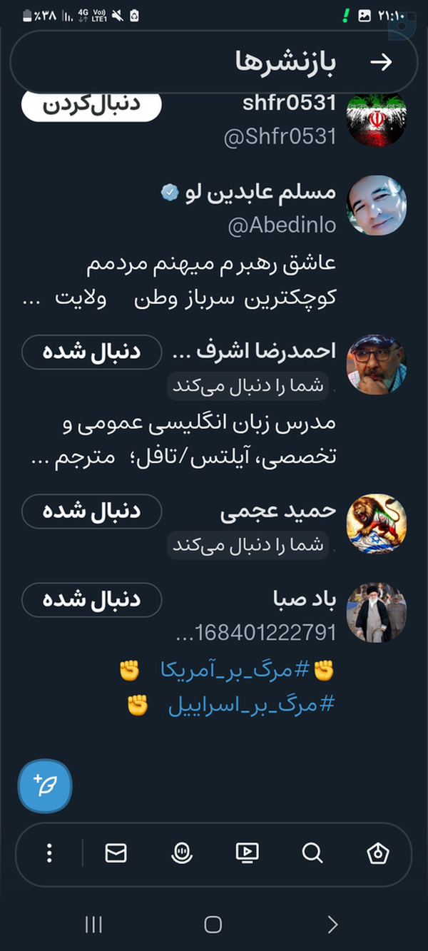 همش ۱۲ بار #بازنشراینه موضع ضد #آمریکائیت.این طوریهحرف تو فقط حقِ.بزرگ کوچک،ریز درشت،هر چی بوده تا دیدیم مطلب ضد دشمن و در راستای منافع ملی بوده دوسال مداوم #بازنشر دادیم،نه موضوع شخصیه نه چیز مُهمل و غیر قابل فهم،یک سرود ملی ضداستعماری و استکباری ه.من بعد دقت کنیم با که داریم #تعامل میکنیم