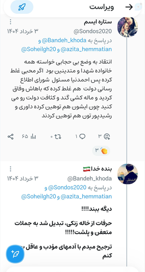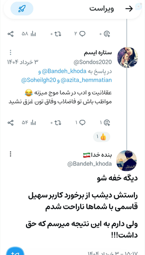 @Bandeh_khoda15 July 2025Replying to and 30 othersهمه کاربران ویراستی را دعوت میکنم به تماشای ادبیات زیبا و فاخر طرفداران جلیلی،در مورد کاربری که هیچگاه ، مثل خودشون زبان به هتاکی و فحاشی باز نکرده‼️‼️‼️‼️‼️هر روز که میگذره ، چشمههایی جدیدی از حیا و تقوای جماعت سوپرانقلابی فوران میکنه و ملت بیش از پیش به بطلان این تفکر واقف میشوند الحمدلله