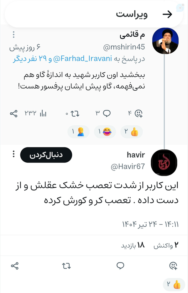 @Havir6715 July 2025Replying to and 30 othersاین کاربر از شدت تعصب خشک عقلش و از دست داده . تعصب کر و کورش کرده