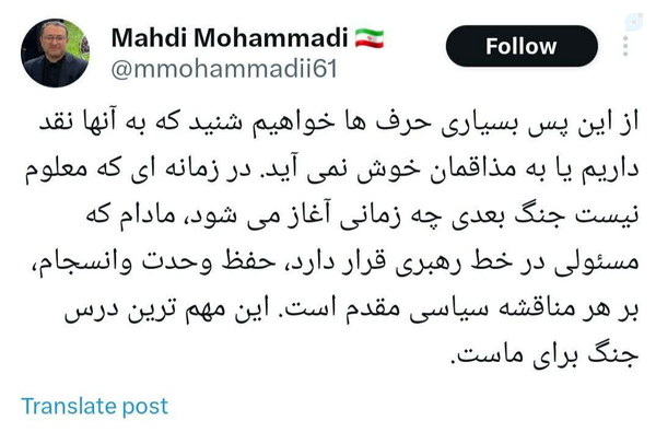 انسجام بر هر مناقشه سیاسی مقدم است.▪️محمدی در حالی با حربه "مسئول در خط رهبری"، به منتقدان مصاحبه پزشکیان تاخته است که محتوای این مصاحبه کاملا بر ضد خط رهبری است.▪️محمدی پاسخ دهد آیا رهبری همانند پزشکیان قائل به تفکیک نتانیاهو و ترامپ است؟ آیا رهبری از موضع ضعف خواهان مذاکره با آمریکاست؟ آیا