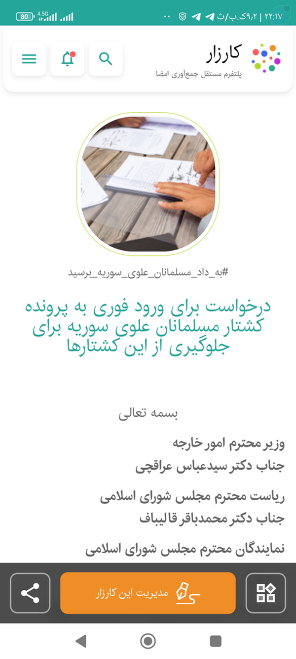 @hamidreza_k13 July 2025Replying toکارزار درخواست حمایت از مسلمان شیعه سوریه که درحال کشتار و شکنجه توسط رژیم الجولانی هستند، هرکی غیرت داره لطفاً این 👇پویش رو امضاء کنهhttps://www.karzar.net/209994با تشکر از همه دوستان عزیزی که مارو در این کارخیر یاری کنند،حتی به اندازه یک امضاء❤️
