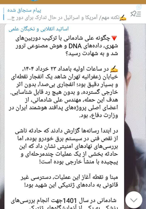 @Alahommaagellevaliekalfarag19 تیر 1404یادداشت در فضای مجازی منتشر شود... دانستن این مسایل بر فرض اینکه صحیح باشد برای عموم مردم چه سودی دارد، به جز ایجاد رعب و وحشت از دشمن!⚠️ ما نمیدانیم که از نظر علمی شناسایی افراد از طریق DNA امری ممکن است یا نه، اما به نظر میرسد چنین متنی با این اشتباهات، ساخته و پرداخته دست دشمنان یا