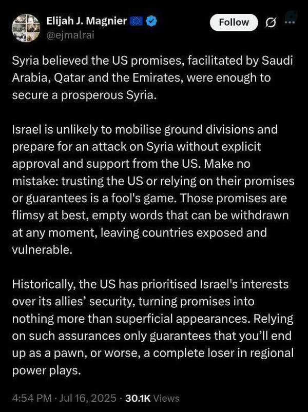 📌"مگنیه"، خبرنگار و تحلیلگر سیاسی:🔹#سوریه به اشتباه تصور میکرد که وعدههای آمریکا، که با میانجیگری عربستان سعودی، قطر و امارات تسهیل شده بودند، برای تضمین یک سوریه مرفه کافیست.❗️🔸بعید است که اسرائیل بدون تأیید و حمایت صریح ایالات متحده، لشکرهای زمینی خود را برای حمله به سوریه بسیج کند. 🔹اشتباه نکنید! اعتماد به ایالات متحده یا تکیه بر وعدهها یا تضمینهای آنها یک بازی احمقانه است. این وعدهها در بهترین حالت، پوچ و توخالی هستند. کلماتی که میتوانند در هر لحظه پس گرفته شوند و کشورها را در معرض خطر و آسیبپذیری قرار دهند.