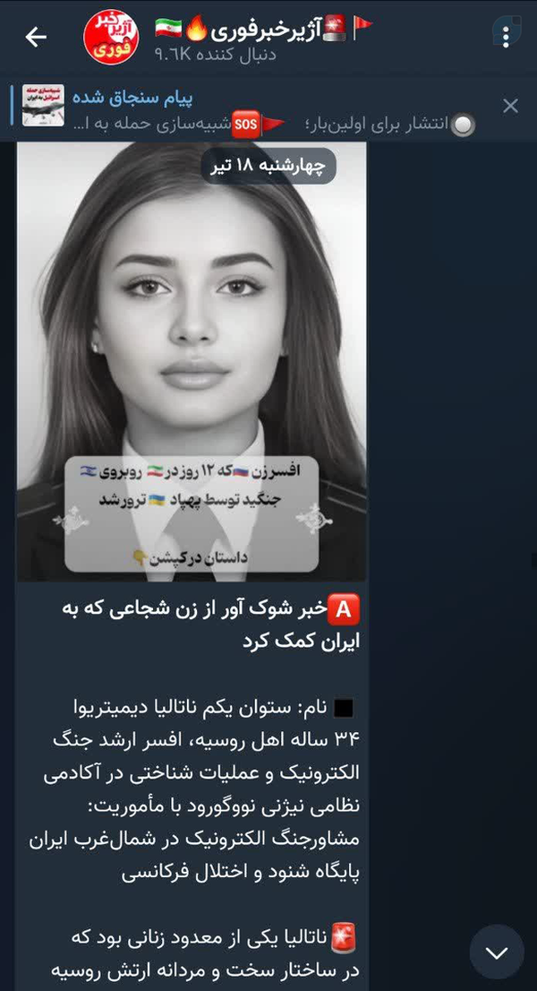 ⚠️ مطلبی که صد ها هزار نفر در اینستاگرام فارسی تصور میکنند که این عکس یک زن روس است که آمده ایران و با اسرائیلی ها جنگیده و کشته شده است....❌ با عنوان خبر شوک آور کمک ستوان ناتالیا که به ایران کمک کرد شایعه است.❌هیچ منبع معتبر و قابل اعتنایی برای این مطلب یافت نشد.