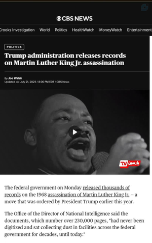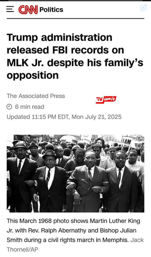 💢 این اسناد شامل گزارشهای داخلی FBI، یادداشتهای تحقیقاتی و جزئیات جدیدی از تعقیب جیمز ارل ری، قاتل مارتین لوتر کینگ، هستند و از سال ۱۹۷۷ تحت مهر و موم قضایی قرار داشتند. با این حال، انتشار این اسناد با مخالفت فرزندان زندهی کینگ، مارتین لوتر کینگ سوم و برنیس کینگ، مواجه شده است.
