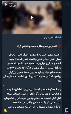 📌متن شبهه👇تلویزیون عربستان سعودی اعلام کرد: اجساد مطهر چند تن ازشهدای جنگ احد را بخاطر سیل اخیر، خرابی قبور و آشکار شدن اجساد جابجا کرده و در این میان جسدحمزه سید الشهداء عموی بزرگوار پیامبر و دیگر شهداء جنگ احد بعد از ۱۴۰۰سال همه سالم بوده وحتی بر روی جسد عموی