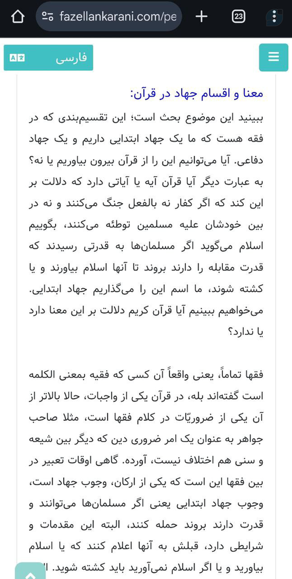 @YasinMashayekhi13 July 2025Replying toاولا که حداقل عکسی که گذاشتم رو خوب بخون. سواد داری چی نوشته؟ تو حتی نخونده داری نقد میکنی.این هم سند از جهاد ابتدایی. طائفه اول یعنی مشرکین رو ابتدا بع اسلام دعوت میکنن و اگه نپذیرن کشته میشن. (حتی اگه قبلش با ما جنگی نکرده باشن)