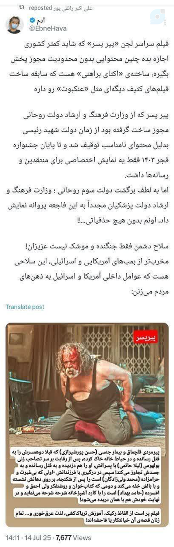 [ اسم این جماعت (دول.لت) رو باید بزاریم:«دشمن توی دروازههای شهر»😡😱🔥]🔻 توییت کاربران توییتر✍ فیلم سراسر لجن «پیر پسر» که شاید کمتر کشوری اجازه بدهچنین محتوایی بدون محدودیت،مجوز پخش بگیره.!؟ساختهٔ «اکتای براهنی» هست کهسابقه ساخت فیلمهای کثیف دیگهای…Show more