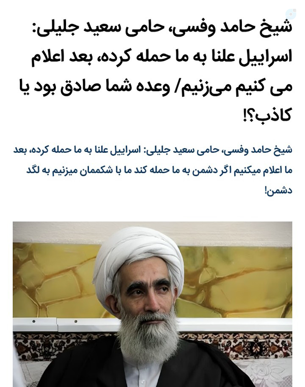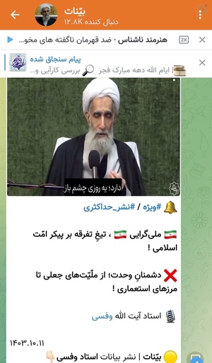 اقای وفسی:ملی گرایی تیغ تفرقه بر پیکر امت!رهبر: ملی گرایی و دین دو مؤلفه قدرت کشور هستندحواسمان باشدفریب امثال وفسی ها را نخوریماین ها متحجرینی هستن که با نگاه افراطی خود ملی گرایی را تکفیر میکننداین نگاه اجرهای جدایی و تخاصم دیوار بین امت و ملت را می چیند#فتنه