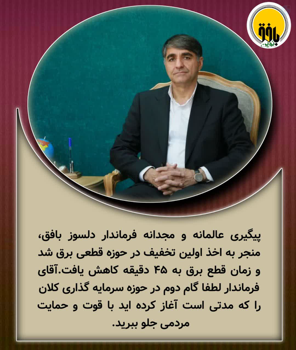 #ویراستیپیگیری عالمانه و مجدانه فرماندار دلسوز بافق، منجر به اخذ اولین تخفیف در حوزه قطعی برق شد و زمان قطع برق به ۴۵ دقیقه کاهش یافت.آقای فرماندار لطفا گام دوم در حوزه سرمایه گذاری کلان را که مدتی است آغاز کرده اید با قوت و حمایت مردمی جلو ببرید.#سرمایهگذاری#مطالبه_مردمی