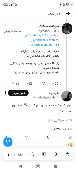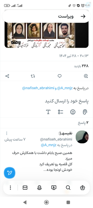 @Banoyirany20 July 2025Replying toسلام نفیسه خانم کمی ویراست شما برام عجیب چرا ۱ـ ادعا می کنید پدر محترم تان در صحنه حضور داشتن ولی۲ـ در جایی دیگر ادعا می کنید خبر را شنیده اید و ابعاد دقیق را نمی دانید ۳- اگر پدرتان نیروی انتظامی شریف خمین هستند چرا آدرس را اراک ثبت کردید در بیو