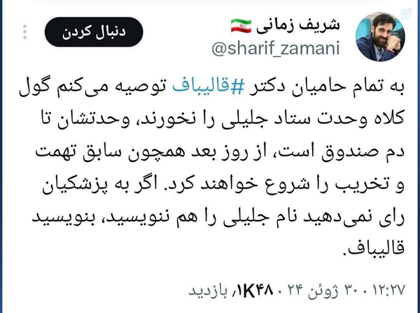 رای دور اول جلیلی ۹ میلیون و پزشکیان ۱۱ میلیون بود این که بدتر شد ! نباید از مشاوره مشاوران و سخنگوی ستاد برای حامیان جناب قالیباف غافل بود پس جوک نگید