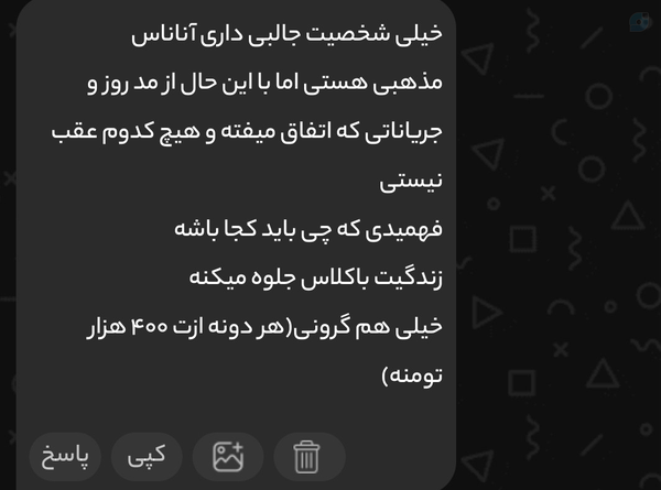 اامیر@Deleteing10 July 2025Replying to @Ananas_135ذهن دادشمون خیلی فقیره که فکرمیکنه ۴۰۰ هزارتومن گرونه😕01070