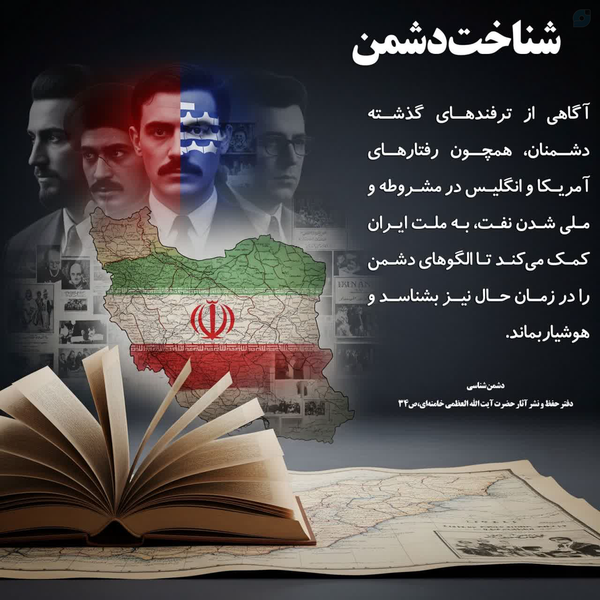 💢شناخت دشمن💠 آگاهی از ترفندهای گذشته دشمنان، همچون رفتارهای آمریکا و انگلیس در مشروطه و ملی شدن نفت، به ملت ایران کمک میکند تا الگوهای دشمن را در زمان حال نیز بشناسد و هوشیار بماند.📚دشمن شناسیدفتر حفظ و نشر آثار حضرت آیت الله العظمی خامنهای، ص۳۴📎#اتحاد_ملی📎#اقتدار_ایرانی