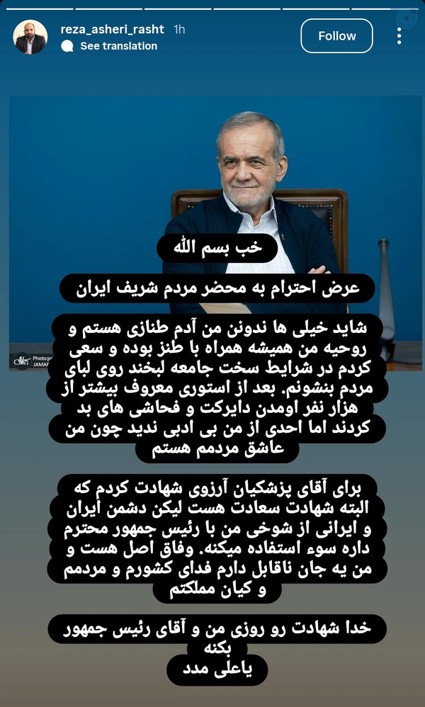 میگفت آسوده منم که خر ندارم درست نیست، آسوده منم که خرم درسته. در یک استوری هم به نظام تهمت زده که گزارش دروغ در مورد شهید رئیسی دادند و ایشون ظاهرا اطلاعاتی دارد که ماها نداریم و اینکه از اسرائیل میخواد رئیس جمهور رو ترور کند!! اینا با این نگاه غلط جناحی در پشت میز مسئولیت نشستند.