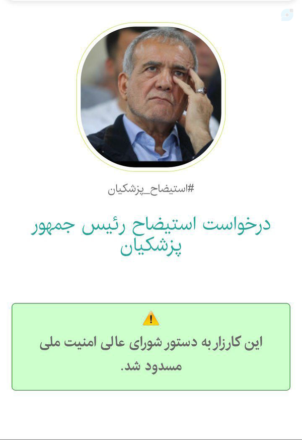 🚨🇮🇷کارزاری که برای استیضاح پزشکیان به راه افتاده بود به دستور شورای عالی امنیت مسدود شدپ ن : ما مدعی آزادی بیان و گفتگوی آزاد هستیم ؟؟؟؟مردم نمیتونن از نمایندگان خودشون درخواستی کنن، چرا پس انتخاب کردن ؟؟؟علت عدم استقبال از انتخابات نمیتونه این رفتارها باشه ؟؟؟و صدها سوال بی پاسخ