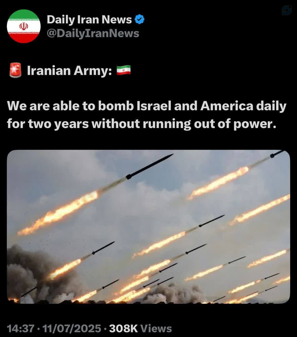 حساب ایکس Daily Iran News:ما قادریم دو سال هر روز اسرائیل و آمریکا را بمباران کنیم، بدون اینکه قدرتمان تمام شود