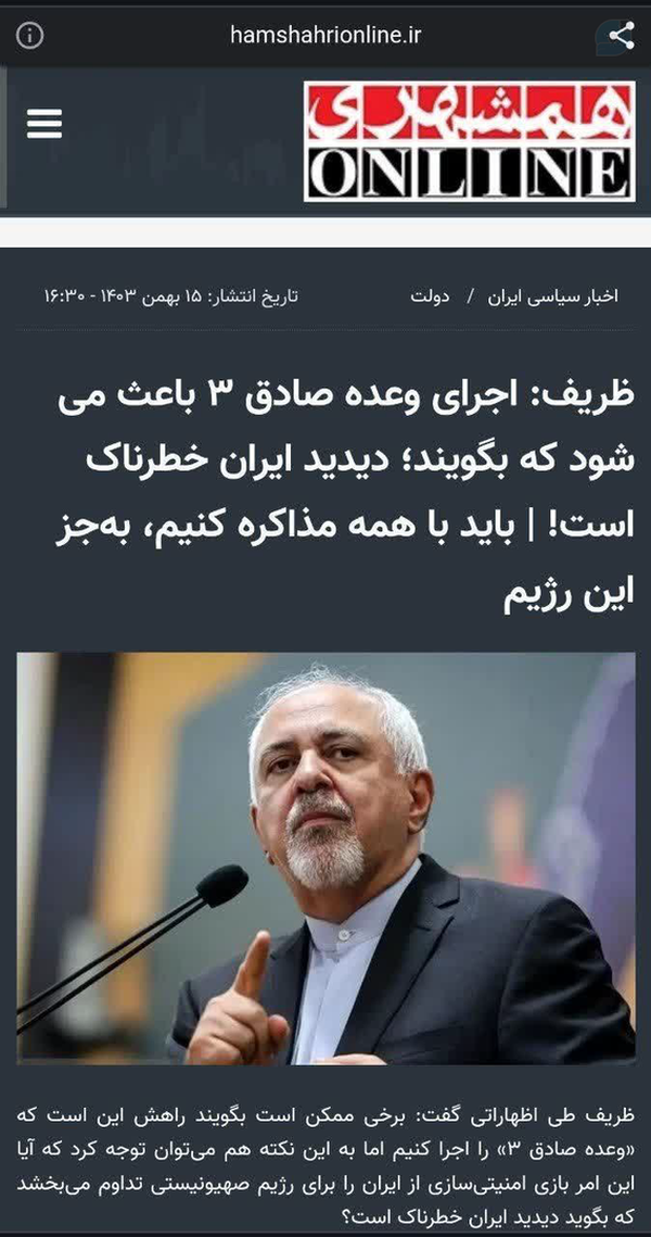 از دلایل #استیضاح_پزشکیانمعاون راهبردی #پزشکیان می گوید #وعده_صادق نباید اجرا و باید با همه #مذاکره کنیم.♻️ اگر شما هم بعد از شنیدن یا دیدن گفتگوی پزشکیان با تاکر کارلسون مجری آمریکایی، به این فکر میکنید که دلیل این همه خوشبینی مفرط به آمریکا، دلیل پاسخهای همراه با تردید رئیس جمهور و دلیل ندیدن جنایتهای آمریکا چیست، لازم نیست راه دوری بروید، کافی است به مواضع اطرافیانش دقت کنید.یادآوری > رئیس قوه قضائیه : پزشکیان می گوید کسی جز ظریف ندارم.