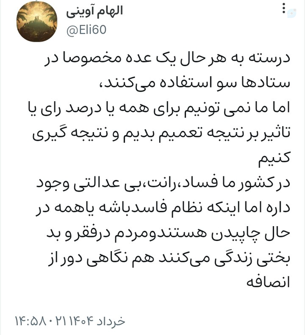 @FATIMA_Hi11 June 2025Replying to and 108 othersدرضمن ب حساب شما،هر ناعدالتی و ظلمی ک حکومتها انجام دادن مردم باید بگن ادم باید داشتههاش رو ببینه چون اگه رو مشکلاتمون زوم کنیم یا بخاطرش اعتراض کنیم نمیتونیم از خوشبختیهامون استفاده کنیم.منطقی نیست و نخواهد بود.