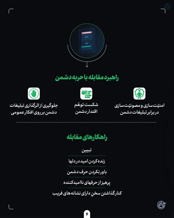 @Fadaeianezinab6914 July 2025📊 #اطلاع_نگاشت | جنگ روایت و رسانه🖼 بخش ۴ از ۶🔹️ در این بخش از اطلاعنگاشت، راهبردهایی که باید برای مقابله با جنگ تبلیغاتی مدنظر داشت، به همراه راهکارها و اقدامات لازم برای این رویارویی را بیان کرده است. 📥 نسخه کامل 🖥 Farsi.Khamenei.ir