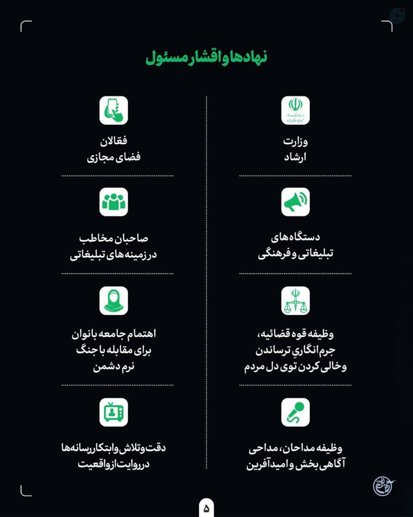 @Fadaeianezinab6914 July 2025📊 #اطلاع_نگاشت | جنگ روایت و رسانه🖼 بخش ۵ از ۶🔹️بخش بعدی در اطلاعنگاشت به ذکر نام نهادها و اقشار مسئول در زمینه امور تبلیغی و رسانهای پرداخته و نمونهای از وظایف آنها را توضیح داده است. 📥 نسخه کامل 🖥 Farsi.Khamenei.ir