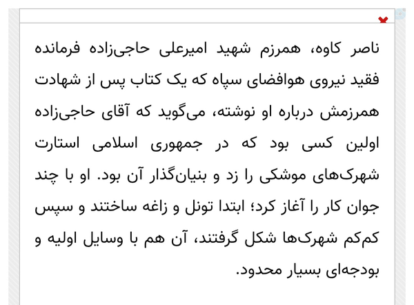 @Sondos202027 July 2025Replying to and 37 othersحاجی زاده تمجید و تشکر کرده چون قالیباف یک زمانی فرمانده هوایی سپاه بوده در حالی که شهر موشکی ایده حاجی زاده بوده نه قالیباف