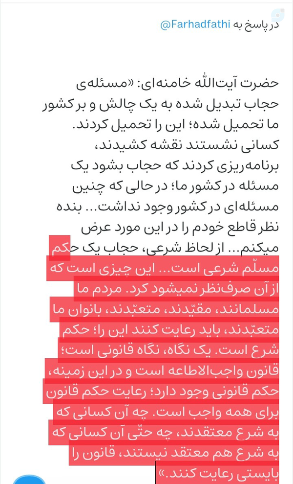 @Yafatemehzahra313_31314 July 2025Replying toضمنا آقای فتحی شرایط حجاب باید درست شود با مطالبه با گفتمان!قانون حجاب باید ابلاغ شود...حجاب حکم خداست