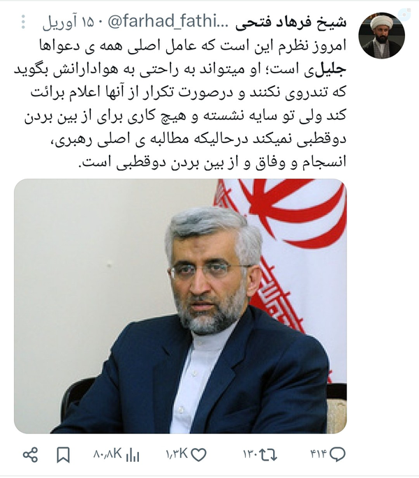 @Farhadfathi19 July 2025Replying toجلیلی 1 میلیونم رای نداره این رای اصولگرایان است، همچنانچه پزشکیان یک میلیون رای ندارد و اون رای اصلاح طلبان است. شما هم جای اینا بودی همین رای با کمی تفاوت رو اخذ میکردید. علتش رو قبلا گفتم، افراطی ها مقلد ایشون هستند و ایشون افسارشون رو نمیکشد تا اتحاد متحقق شد.