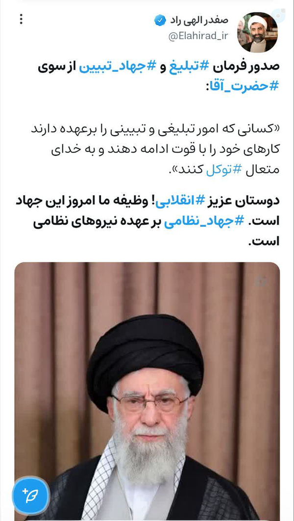 صدور فرمان #تبلیغ و #جهاد_تبیین از سوی #حضرت_آقا:«کسانی که امور تبلیغی و تبیینی را برعهده دارند کارهای خود را با قوت ادامه دهند و به خدای متعال #توکل کنند».دوستان عزیز #انقلابی! وظیفه ما امروز این جهاد است. #جهاد_نظامی بر عهده نیروهای نظامی است.📥 کانال بنیان