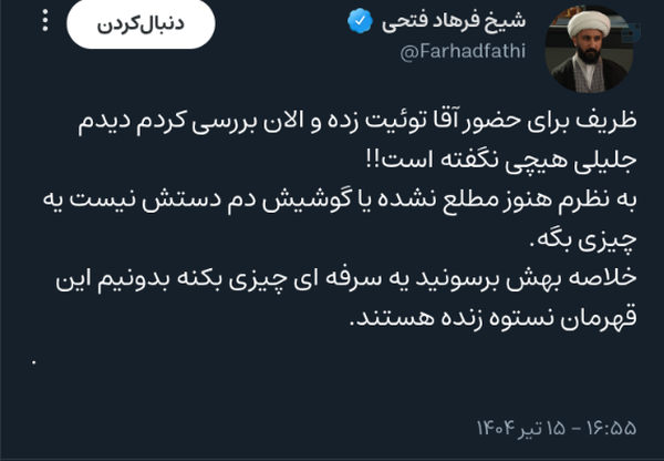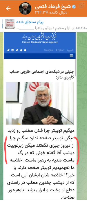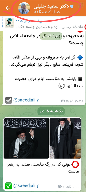 7 July 2025یکی به این نادان بفهمونه آقای جلیلی بیشتر از هر مسیول و وزیر و وکیل دیگه ای تو این مملکت آقارو میبینه نیازی به توییت ندارن برای اثبات ولایت مداریشون نا سلامتی ایشون نماینده رهبری تو شعامن خدایا چرا مارو با اینا داری امتحان میکنی آخه 🤦🏻13310133.1k813016321