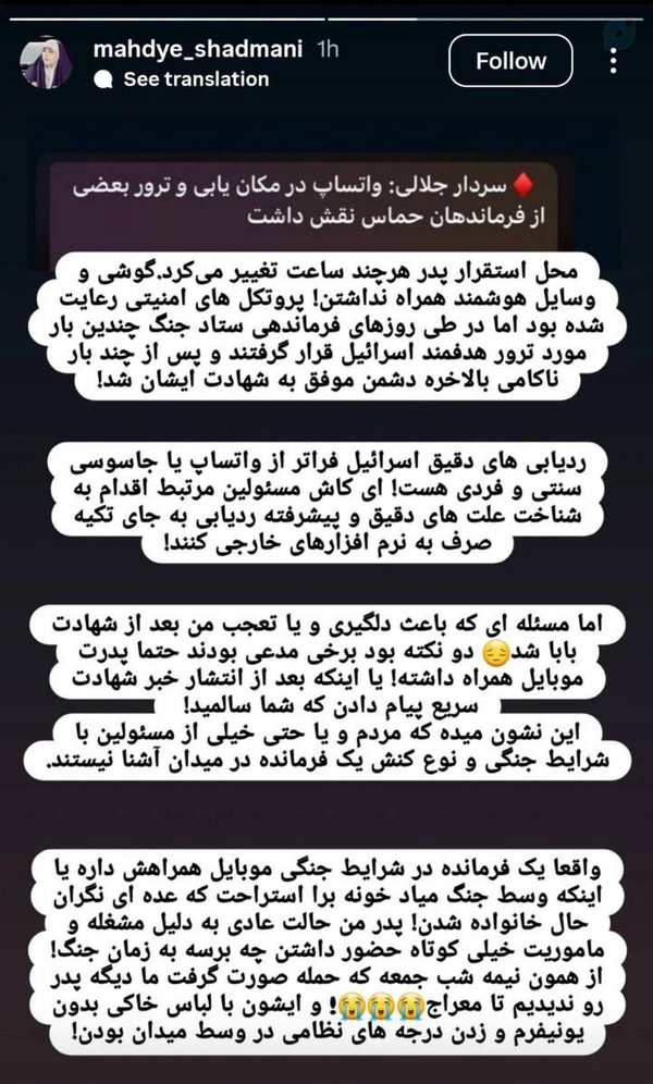 @ksh_1104 July 2025Replying toالبته اگر دقت بفرمایید ،فرمودند شهید اصلا این مدت خانه نیامدند ...بنظر میرسه از هوش مصنوعی از طرق ریزپرنده یا پهباد، ازطریق چهره اقدام به ترور شده ..