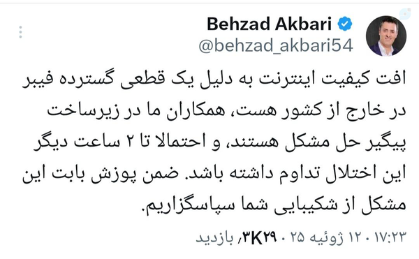 🔘دکتر اکبری معاون وزیر و مدیرعامل شرکت ارتباطات زیرساخت در خصوص افت کیفیت اینترنت در پیامی در شبکه ایکس نوشت: 🔹️افت کیفیت اینترنت به دلیل یک قطعی گسترده فیبر در خارج از کشور هست، همکاران ما در زیرساخت پیگیر حل مشکل هستند، و احتمالا تا ۲ ساعت دیگر این اختلال تداوم داشته باشد.Show this thread