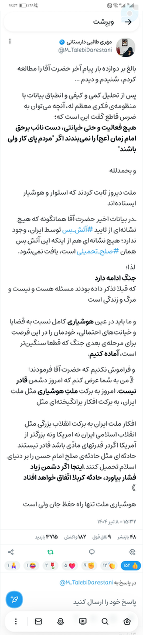 خیر مطلب ایشون بعد از بیانات سوم رهبری بود که ایشون اطمینان پیدا کردند رهبری آتش بس رو نپذیرفتند و تایید نکردند این پایان جنگ استچیزی که متاسفانه وفاقیون به اسم پایان جنگ ازش یاد میکنند درحالی که نیروهای مسلح ما دست بر روی ماشه و در حال آماده باش کامل هستند و رهبری هم هیچ اشاره ای به آتش بس نکردند