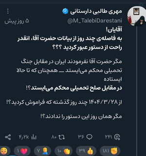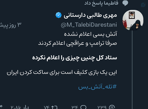 قابل توجه افرادی کهخانم طالبی دارستانی را در مورد یک توئیت در مورد فرماندهان هنوز که هنوز،تخریب میکنند!باید بگویم که،خانم طالبی آن توئیت را وقتی که شهید سید حسن نصرالله، به شهادت رسیده بودند و اسرائيل رهبری را تهدید به ترور کردند،نوشتند و بعد از وعده صادق 2، پاک کردند و از فرماندهان تشکر هم کردند