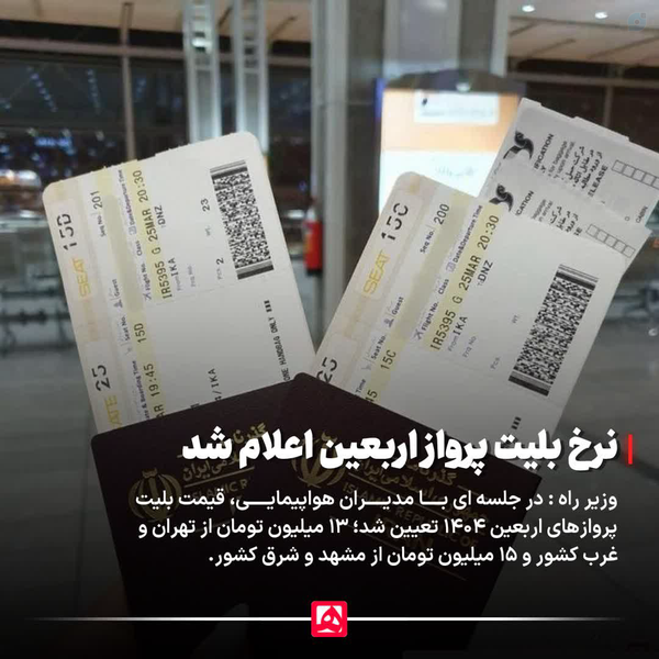 🔴نرخ بلیت پرواز اربعین اعلام شدوزیر راه و شهرسازی :🔹 روز گذشته جلسه ای با حضور مدیران عامل شرکتهای هواپیمایی با موضوع نرخ بلیت پروازهای اربعین برگزار شد. در این جلسه مصوب شد قیمت بلیت پروازهای رفت و برگشت اربعین از مبدا تهران و فرودگاههای غرب کشور ۱۳ میلیون تومان باشد.