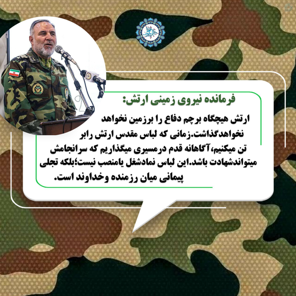 فرمانده نیروی زمینی ارتش:🔴 پرچم دفاع و مقاومت تا ظهور حضرت ولیعصر (عج) برافراشته خواهد ماند و دلاورمردان ارتش هرگز آن را بر زمین نخواهند گذاشت.🔹لباس ارتش نماد شغل نیست، بلکه عهدی الهی است که رزمنده آگاهانه آن را میپذیرد، حتی اگر به شهادت ختم شود.