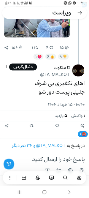 @shahid1205 July 2025Replying to and 29 othersمشکوک میزنه!! چونمثل سوپر انقلابیها نیست که دائم در حال تخریب مسوولان نظام و فرماندهان باشه واقعا مشکوک هست و باید گزارشش کنین و بگین یکی تو ویراستی هست اینکارها را نمیکنه خیلی مشکوک و عجیبه🤔