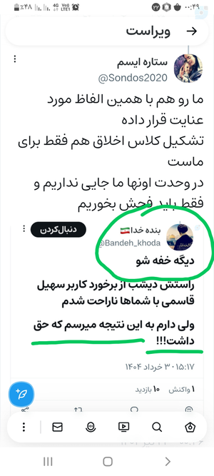 @Bandeh_khoda15 July 2025Replying to and 30 othersهمه کاربران ویراستی را دعوت میکنم به تماشای ادبیات زیبا و فاخر طرفداران جلیلی،در مورد کاربری که هیچگاه ، مثل خودشون زبان به هتاکی و فحاشی باز نکرده‼️‼️‼️‼️‼️هر روز که میگذره ، چشمههایی جدیدی از حیا و تقوای جماعت سوپرانقلابی فوران میکنه و ملت بیش از پیش به بطلان این تفکر واقف میشوند الحمدلله