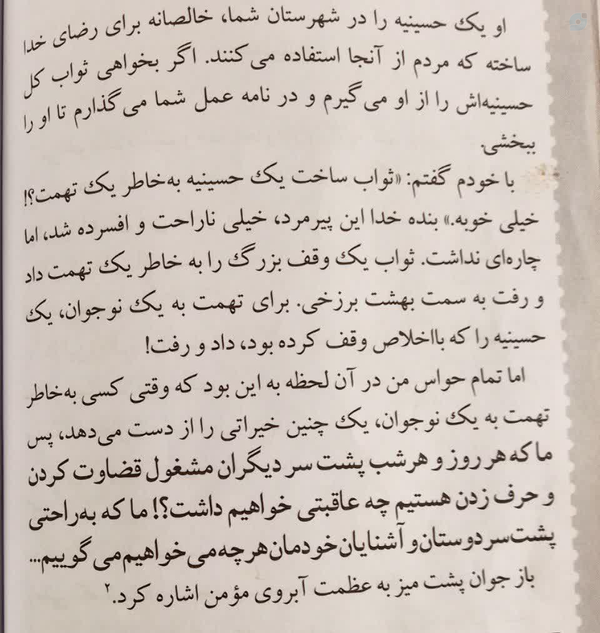 وقتی کسی بخاطر تهمت به یک نوجوان، یک چنین خیراتی را از دست میدهد، پس ما که هر روز و هر شب پشت سر دیگران مشغول قضاوت کردن و حرف زدن هستیم چه عاقبتی خواهیم داشت...؟!