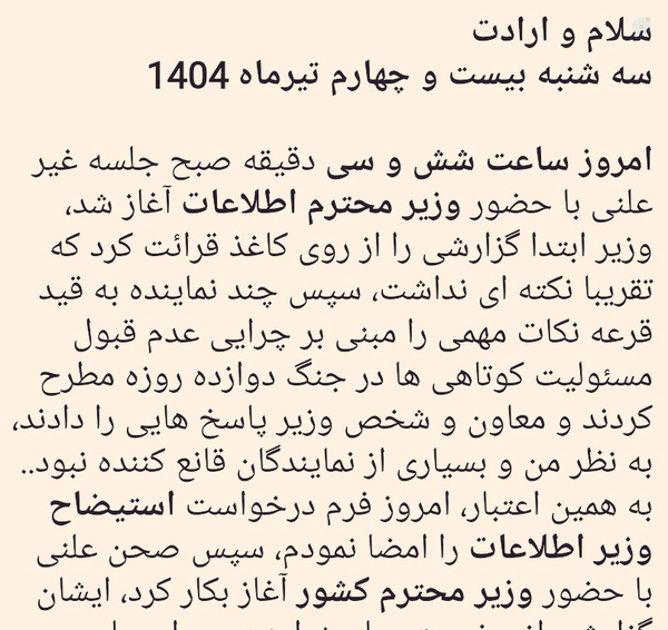 19 July 2025توضیح خودشون در ایتاحجةالاسلام اخلاقی، نماینده مشهد؛فرم درخواست #استیضاح_خطیب ، وزیر اطلاعات را امضا کردم.احسنت...#توییت