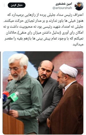 @shahid12012 July 2025Replying to and 36 othersواقعا نمیدونی نقش جلیلی در انتخابات چی بودچرا به حرف فرماندهان نکرد و گذاشت پزشکیان رای بیارهچرارییس ستادش گفت ما میدونستیم جلیلی رای منفی داره یعنی مردم برای اینکه اون رای نیاره میروندسمت پزشکیان ولی ماندوپزشکیان را رییس جمهورکرد؟کاری که جلیلی کرد رییسجمهور کردن پزشکیان بودنقشش راخوب انجام داد