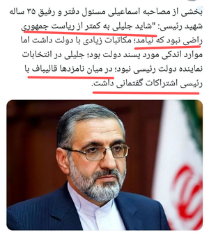 @Iranbanoo12 July 2025Replying to and 36 othersرهبری از رفسنجانی هم تعریف کرده بودنتو بقیه تصاویری که فرستادی اسمی از قالیباف نیستضمن اینکه مردم به قالیباف رای ندادنهمانطور که به جلیلی رای ندادنما الان نقدمون به اینه که مردم به بدترین گزینه رای دادنشما چرا گیر دادی به جلیلی الان جلیلی هم مثل قالیباف مردم نخواستنششما چرا پای جلیلی رو میکشی