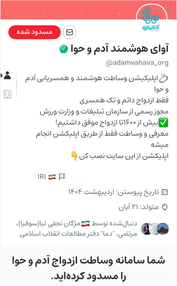 سید داود@Dr___it10 June 2025Replying to @Jadidi8077اینا بیشتر کانون صیغه یابی هستن ولی میزنن تک همسری و ازدواج دائم که بتونن راحت فعالیت کنن همون ******30016021
