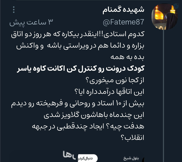@honey1213 July 2025Replying to andوقتی قدرتشو ندارن به مطالب قوی و مفید یک شخص نقد وارد کنن و حتی قدرت مخالفت هم ندارن (چون جوابی ندارن ) شروع میکنن ب تخریب شخص!!! هرروز اینهمه اتاق سخیف و مزخرف، ملت توی ویراستی میزنن !چه گیری به اتاقای استادکاوه یاسر دادید؟!